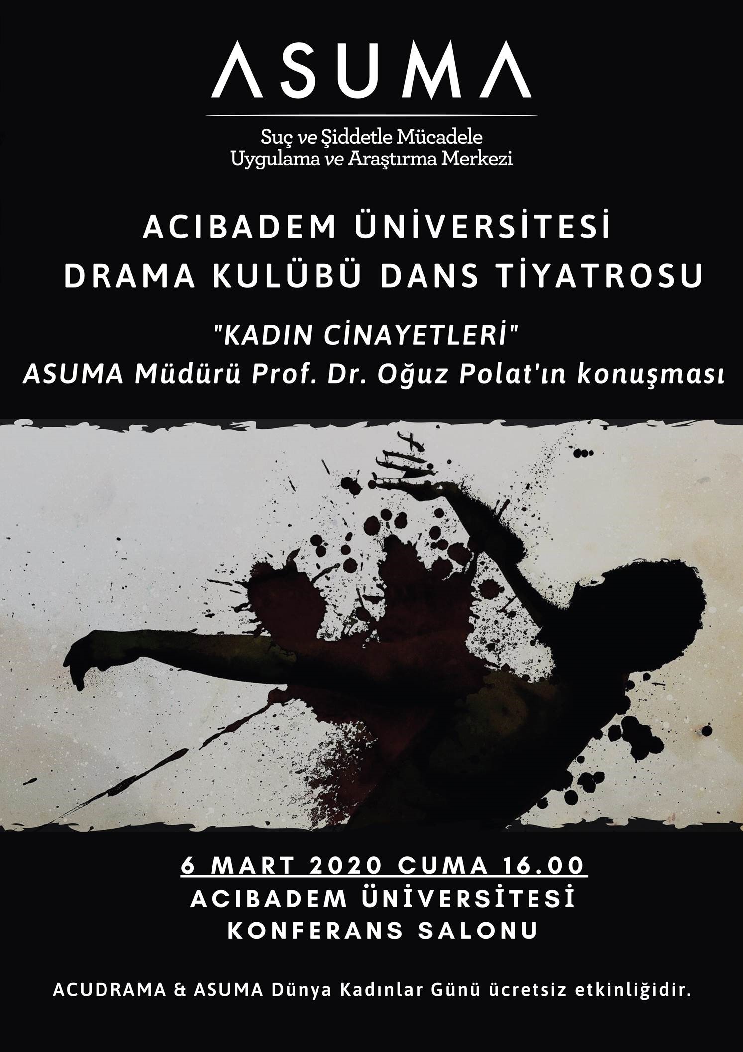 Acıbadem Üniversitesi Drama Kulübü ve ASUMA (Acıbadem Suç ve Şiddetle Mücadele,Uygulama ve Araştırma Merkezi) işbirliği ile 6 Mart Cuma 16.00′da, ASUMA Müdürü Prof. Dr. Oğuz Polat’ın konuşmasının ardından, Drama Kulübü Dans Tiyatrosu “Kadın Cinayetleri” performansı gerçekleştirilecek.