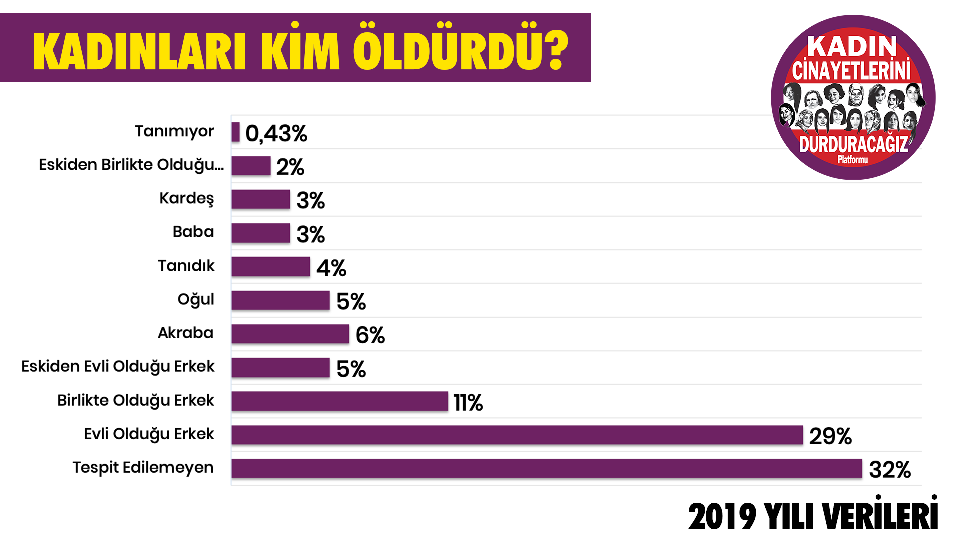 2019 yılında öldürülen 474 kadının 152’sinin kim tarafından öldürüldüğü tespit edilemedi. Kadınların 134’ünü evli oldukları erkek, 25’ini eski eşleri, 51’ini birlikte olduğu erkek ve 8’ini eskiden birlikte olduğu erkek öldürdü. 29 kadının canını amcası, eniştesi, evli olduğu erkeğin babası aldı. 19 kadını tanıdıkları öldürdü. 15 kadın babası, 13 kadın kardeşi, 25 kadın da oğlu, komşusu, çocuğunun arkadaşının velisi tarafından katledildi. 3 kadın ise tanımadığı kişiler tarafından öldürüldü.