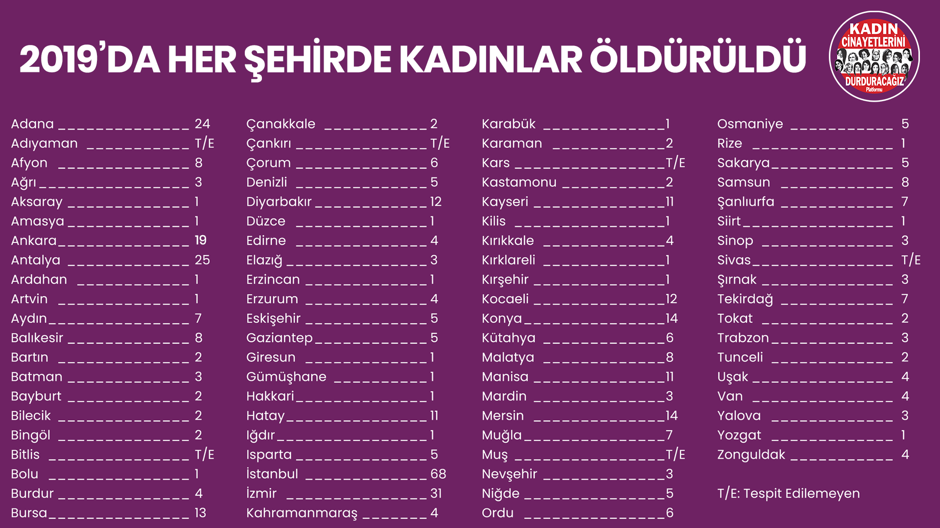 Kadın Cinayetlerini Durduracağız Platformu’nun raporuna göre, kadın cinayetlerinin son on yılın en yüksek seviyesine ulaştığı 2019 yılı içerisinde, Türkiye’nin tüm illerinde kadın cinayeti işlendi.