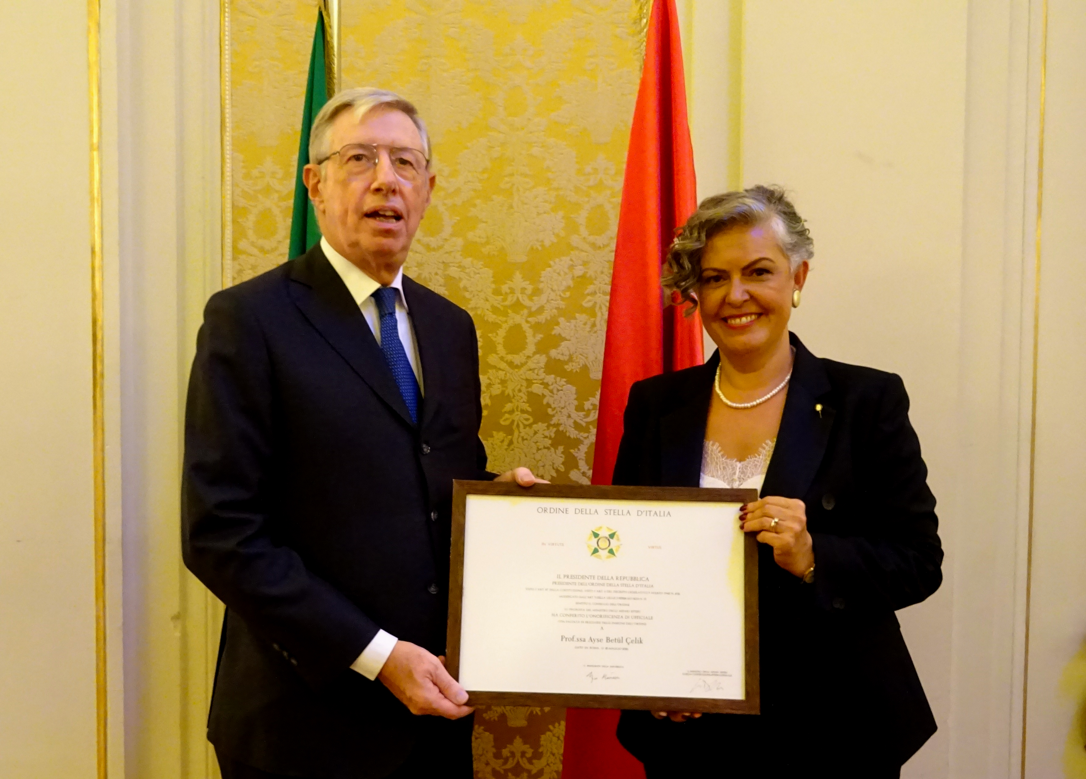 Prof. Çelik, İtalyan Büyükelçiliği tarafından aday gösterilen ve İtalyan Cumhurbaşkanı tarafından verilen “Order of the Star of Italy (Ordine della Stella d’Italia)” ödülünü “Official (Ufficiale)” rütbesi ile aldı.