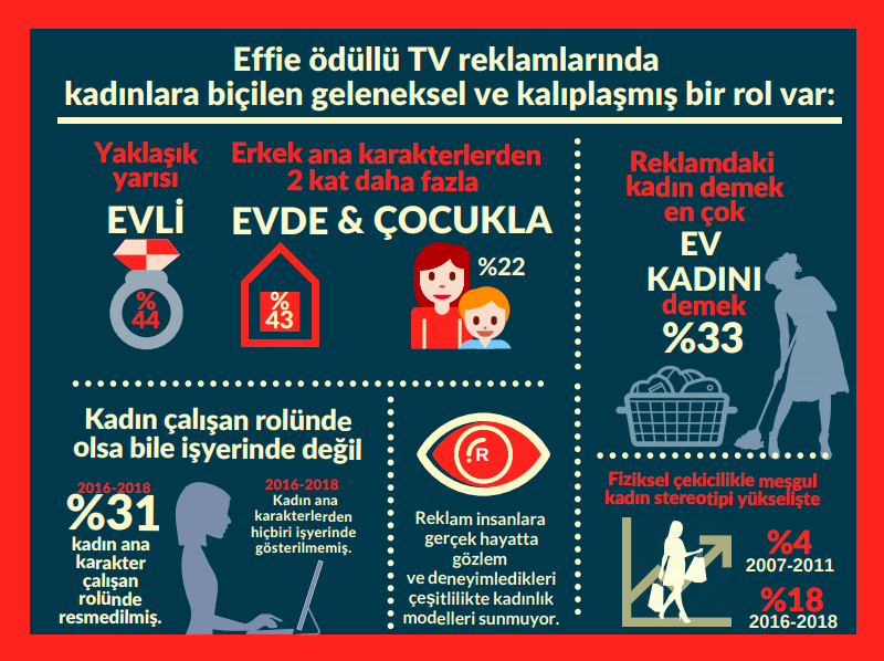 ‘Türkiye’deki Effie Ödüllü TV Reklamlarının 10 Yıllık Toplumsal Cinsiyet Eşitliği Karnesi’ araştırmasına göre, reklamlarda toplumsal cinsiyet rolleri yeniden üretiliyor ve kadınlar erkeklere oranla daha az görünüyor.