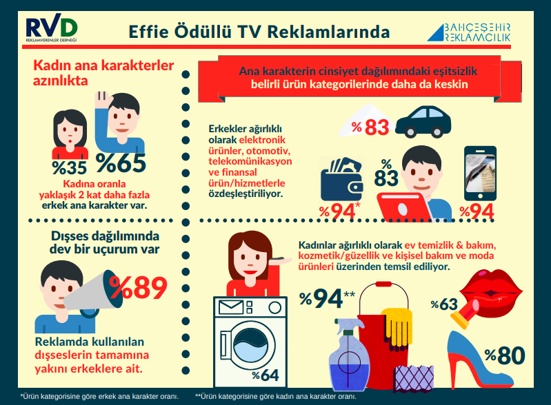 RVD Reklamda Toplumsal Cinsiyet Eşitliği Platformu ve Bahçeşehir Üniversitesi’nin (BAU) Reklamcılık bölümünün işbirliğiyle ‘Türkiye’deki Effie Ödüllü TV Reklamlarının 10 Yıllık Toplumsal Cinsiyet Eşitliği Karnesi’ başlıklı araştırma geçtiğimiz ay yayımlandı. Araştırmada, toplumsal cinsiyet eşitliği bağlamında kadınların reklam filmlerindeki temsiliyet biçimi ele alındı. Kadınların reklamlarda geleneksel rollerde temsil edildiğinin belirlendiği araştırmada, son on yılda reklamlarda görülme sıklığının ise azaldığı tespit edildi.