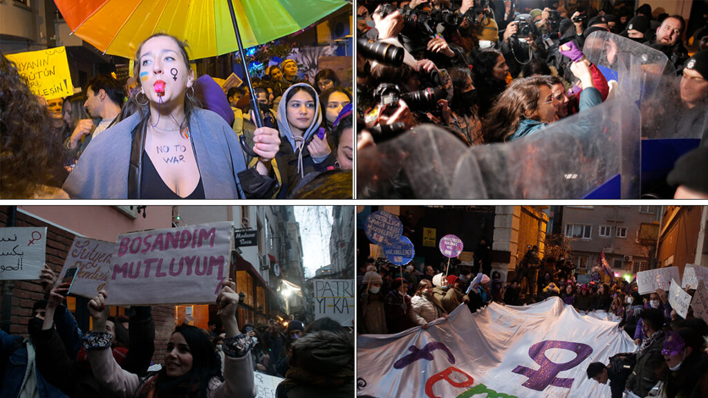 Yasaklara rağmen geri adım atmayan binlerce kadın, “Yaşasın feminist mücadelemiz” sloganlarıyla geceyi aydınlatırken, patriyarkaya karşı teslim olmayacaklarını bir kez daha tüm dünyaya ilan etti.